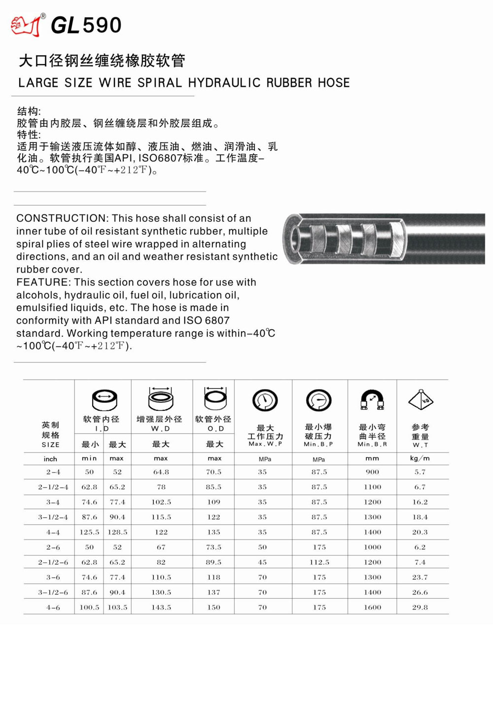 FEATURE: This section covers hose for use with alcohols, hydraulic oil, fuel oil, lubrication oil, emulsified liquids, etc. The hose is made in conformity with API standard and ISO 6807