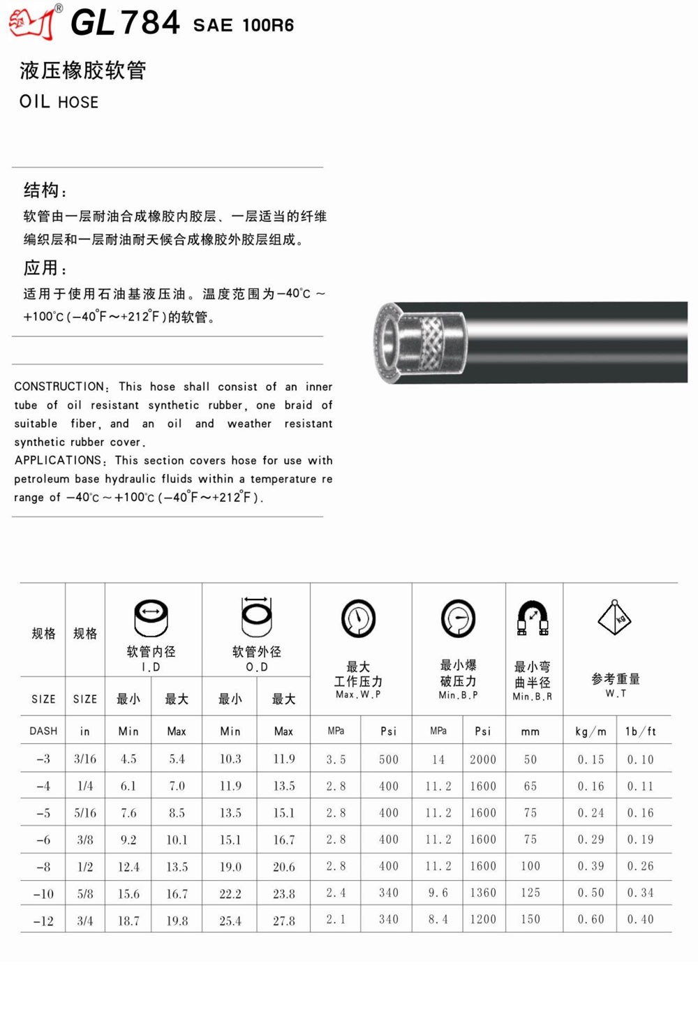 ICATIONS: This section covers hose for use with leum base hydraulic fluids within a temperature re of -40°C ~ +100°C (-40°F ?+212°F ).
